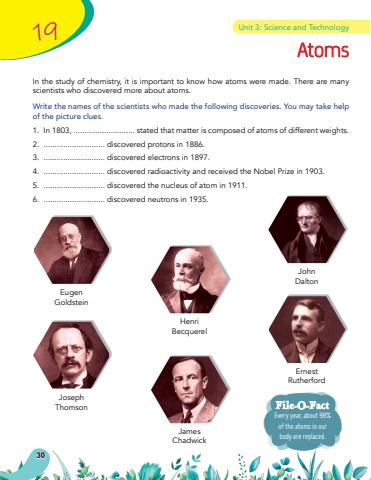 AtomsIn the study of chemistry, it is important to know how atoms were made. There are many scientists who discovered more about atoms.Write the names of the scientists who made the following discoveries. You may take help of the picture clues.1.In 1803, ............................ stated that matter is composed of atoms of different weights.2............................. discovered protons in 1886.3............................. discovered electrons in 1897.4............................. discovered radioactivity and received the Nobel Prize in 1903.5............................. discovered the nucleus of atom in 1911.6............................. discovered neutrons in 1935.Eugen GoldsteinJosephThomsonJamesChadwickErnestRutherfordHenri BecquerelJohnDalton19Every year, about 98% of the atoms in our body are replaced.File-O-FactUnit 3: Science and Technology30