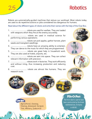 Robots are automatically-guided machines that reduce our workload. Most robots today are used to do repetitive actions or jobs considered too dangerous for humans.Read about the different types of robots and write their names with the help of the Clue Box.1.............................. robots are used for warfare. They are loaded with weapons which they fire at the enemy accurately. 2.............................. robots are used in medical science for performing various operations.3.............................. robots can pick apples, gather harvest, plant seeds and transplant seedlings. 4.............................. robots have an amazing ability to entertain. They can dance to the music for which they are programmed.5.............................. robots are great help in household work. They are also used at hotels, airports, etc.6.............................. robots are sent into space. They can collect relevant information with precision.7.............................. robots work in factories. They work efficiently and without tiring, thus increasing production and reducing cost.8.............................. robots are almost like humans. They are research tools.25RoboticsAgricultural, Cleaning, Dancing, Humanoid, Surgical, Tele, Military, IndustrialClue BoxThe first robot is said to have been constructed by the Greek mathematician, Archytas in 400 BC.File-O-Fact36