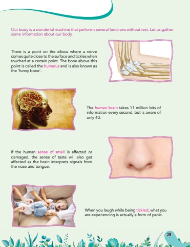 When you laugh while being tickled, what you are experiencing is actually a form of panic.Our body is a wonderful machine that performs several functions without rest. Let us gather some information about our body.If the human sense of smell is affected or damaged, the sense of taste will also get affected as the brain interprets signals from the nose and tongue.There is a point on the elbow where a nerve comes quite close to the surface and tickles when touched at a certain point. The bone above this point is called the humerus and is also known as the 'funny bone'.The human brain takes 11 million bits of information every second, but is aware of only 40.39