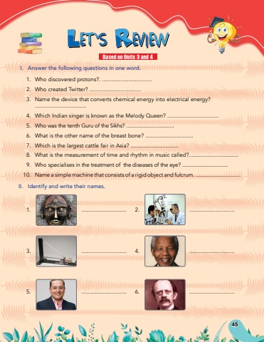 Based on Units 3 and 4I.Answer the following questions in one word.1.Who discovered protons?. ................................2.Who created Twitter? .................................3.Name the device that converts chemical energy into electrical energy? .................................4.Which Indian singer is known as the Melody Queen? .................................5.Who was the tenth Guru of the Sikhs? .................................6.What is the other name of the breast bone? .................................7.Which is the largest cattle fair in Asia? .................................8.What is the measurement of time and rhythm in music called?..................................9.Who specialises in the treatment of the diseases of the eye? ..................................10.Name a simple machine that consists of a rigid object and fulcrum. ...............................II.Identify and write their names.1..............................2..............................3..............................4..............................5..............................6..............................45