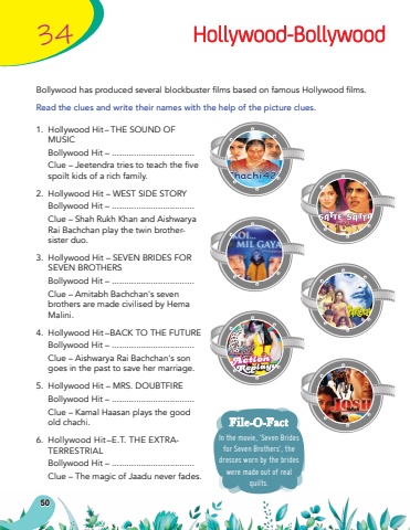 34Hollywood-BollywoodBollywood has produced several blockbuster films based on famous Hollywood films. Read the clues and write their names with the help of the picture clues.1.Hollywood Hit %u2013 THE SOUND OF MUSICBollywood Hit %u2013 ..................................Clue %u2013 Jeetendra tries to teach the five spoilt kids of a rich family.2.Hollywood Hit %u2013 WEST SIDE STORYBollywood Hit %u2013 ..................................Clue %u2013 Shah Rukh Khan and Aishwarya Rai Bachchan play the twin brothersister duo.3.Hollywood Hit %u2013 SEVEN BRIDES FOR SEVEN BROTHERSBollywood Hit %u2013 ..................................Clue %u2013 Amitabh Bachchan's seven brothers are made civilised by Hema Malini.4.Hollywood Hit %u2013BACK TO THE FUTUREBollywood Hit %u2013 ..................................Clue %u2013 Aishwarya Rai Bachchan's son goes in the past to save her marriage.5.Hollywood Hit %u2013 MRS. DOUBTFIREBollywood Hit %u2013 ..................................Clue %u2013 Kamal Haasan plays the good old chachi.6.Hollywood Hit%u2013E.T. THE EXTRATERRESTRIALBollywood Hit %u2013 ..................................Clue %u2013 The magic of Jaadu never fades.In the movie, 'Seven Brides for Seven Brothers', the dresses worn by the brides were made out of real quilts.File-O-Fact50
