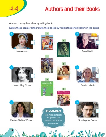 abcdfe44Authors and their BooksAuthors convey their ideas by writing books.Match these popular authors with their books by writing the correct letters in the boxes.Jane Austen Roald Dahl Louisa May AlcottAnn M. MartinJohn Milton composed the greatest epic 'Paradise Lost' after he became blind.File-O-Fact1324Patricia Collins Wrede5Christopher Paolini662