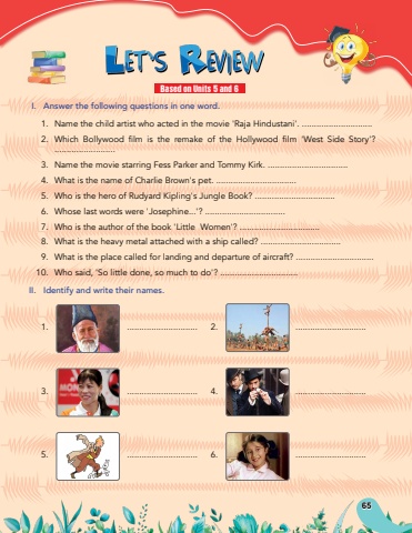 Based on Units 5 and 6I.Answer the following questions in one word.1.Name the child artist who acted in the movie 'Raja Hindustani'. .............................2.Which Bollywood film is the remake of the Hollywood film 'West Side Story'? .........................3.Name the movie starring Fess Parker and Tommy Kirk. .................................4.What is the name of Charlie Brown's pet. .................................5.Who is the hero of Rudyard Kipling's Jungle Book? .................................6.Whose last words were 'Josephine...'? .................................7.Who is the author of the book 'Little Women'? .................................8.What is the heavy metal attached with a ship called? .................................9.What is the place called for landing and departure of aircraft? ................................10.Who said, 'So little done, so much to do'? ................................II.Identify and write their names.1..............................2..............................3..............................4..............................5..............................6..............................65