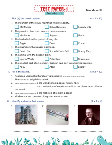 I.Tick (%uf033) the correct option.(6 %u00d7 2 = 12)1.The founder of the NGO Kaziranga Wildlife Society.MC MehtaRobin BanerjeeKisan Mehta2.The parasitic plant that does not have true roots.MistletoeSaguaroLianas3.The bird which is the symbol of long life.EagleDoveCrane4.The mushroom that causes diarrhoea.Death CapSmooth Earth Ball Liberty Cap5.The animal with the biggest brain.Sperm WhalePolar BearChameleon6.The smallest part of an element, that can take part in a chemical reaction.AlloyAtomEnergyII.Fill in the blanks.(6 %u00d7 2 = 12)1.Keoladeo Ghana Bird Sanctuary is located in ................................ .2.The cluster of jellysfish is called ................................ .3................................. is the world's most popular natural fibre.4................................. has a collection of nearly two million art pieces from all over the world.5................................. is the first step of recycling paper.6.Mushrooms are commercially grown in mushroom ................................ .III.Identify and write their names.(3 %u00d7 2 = 6)1.2.3.Based on Units 1-3TEST PAPER-1Max Marks: 3075