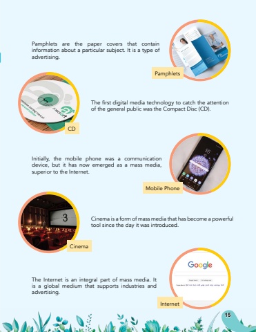 15Pamphlets are the paper covers that contain information about a particular subject. It is a type of advertising.Thefirstdigitalmediatechnologytocatchtheattentionof the general public was the Compact Disc (CD).Initially, the mobile phone was a communication device, but it has now emerged as a mass media, superior to the Internet.Cinema is a form of mass media that has become a powerful tool since the day it was introduced.The Internet is an integral part of mass media. It is a global medium that supports industries and advertising.PamphletsMobile PhoneCinemaInternetCD