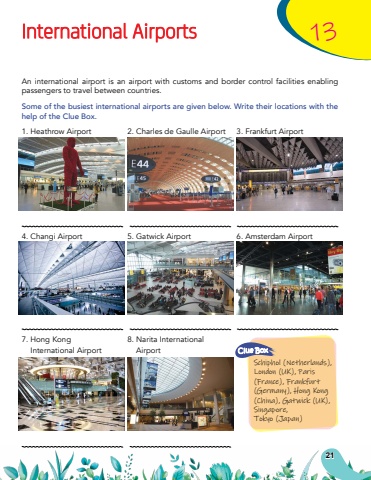 21International Airports13An international airport is an airport with customs and border control facilities enabling passengers to travel between countries.Some of the busiest international airports are given below. Write their locations with the help of the Clue Box.Schiphol (Netherlands), London (UK), Paris (France), Frankfurt (Germany), Hong Kong (China), Gatwick (UK), Singapore, Tokyo (Japan)Clue Box1. Heathrow Airport4. Changi Airport7. Hong Kong International Airport2. Charles de Gaulle Airport5. Gatwick Airport8. Narita International Airport3. Frankfurt Airport6. Amsterdam Airport