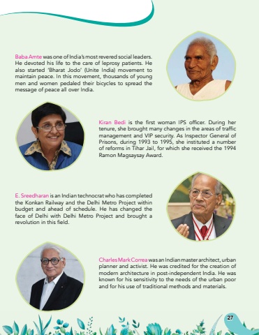27Baba Amte was one of India%u2019s most revered social leaders. He devoted his life to the care of leprosy patients. He also started %u2018Bharat Jodo%u2019 (Unite India) movement to maintain peace. In this movement, thousands of young men and women pedaled their bicycles to spread the message of peace all over India.Kiran BediisthefirstwomanIPSofficer.Duringhertenure,shebroughtmanychangesintheareasoftrafficmanagement and VIP security. As Inspector General of Prisons, during 1993 to 1995, she instituted a number of reforms in Tihar Jail, for which she received the 1994 Ramon Magsaysay Award.Charles Mark Correa was an Indian master architect, urban planner and activist. He was credited for the creation of modern architecture in post-independent India. He was known for his sensitivity to the needs of the urban poor and for his use of traditional methods and materials.E. Sreedharan is an Indian technocrat who has completed the Konkan Railway and the Delhi Metro Project within budget and ahead of schedule. He has changed the face of Delhi with Delhi Metro Project and brought a revolutioninthisfield.