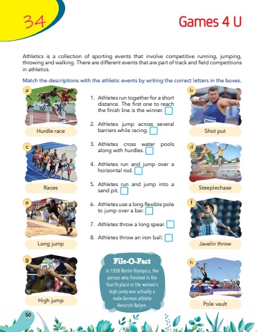 5034Athletics is a collection of sporting events that involve competitive running, jumping, throwingandwalking.Therearedifferenteventsthatarepartoftrackandfieldcompetitionsin athletics.Match the descriptions with the athletic events by writing the correct letters in the boxes.Hurdle raceRacesLong jumpHigh jumpShot putSteeplechaseJavelin throwPole vault1.Athletes run together for a short distance.Thefirstonetoreachthefinishlineisthewinner.2.Athletes jump across several barriers while racing. 3.Athletes cross water pools along with hurdles. 4.Athletes run and jump over a horizontal rod. 5.Athletes run and jump into a sand pit. 6.%u0009 Athletesusealongflexiblepoleto jump over a bar. 7.Athletes throw a long spear. 8.Athletes throw an iron ball. In 1936 Berlin Olympics, the person who finished in the fourth place in the women%u2019s high jump was actually a male German athlete Heinrich Ratjen.File-O-FactGames 4 U