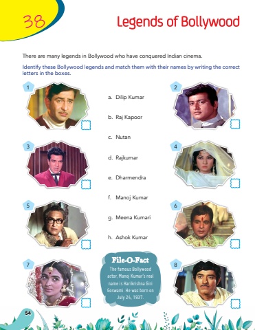 5438Legends of BollywoodThere are many legends in Bollywood who have conquered Indian cinema.Identify these Bollywood legends and match them with their names by writing the correct letters in the boxes.a.Dilip Kumar b.Raj Kapoor c.Nutan d.Rajkumare.Dharmendra f.Manoj Kumar g.Meena Kumarih.Ashok Kumar78The famous Bollywood actor, Manoj Kumar%u2019s real name is Harikrishna Giri Goswami. He was born on July 24, 1937.File-O-Fact123456