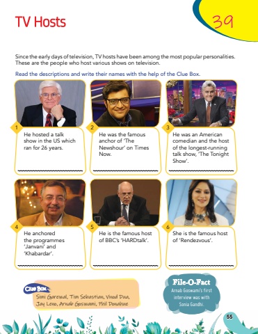 55Since the early days of television, TV hosts have been among the most popular personalities. These are the people who host various shows on television.Read the descriptions and write their names with the help of the Clue Box.TV Hosts39Simi Garewal, Tim Sebastian, Vinod Dua, Jay Leno, Arnab Goswami, Phil DonahueClue BoxArnab Goswami%u2019s first interview was with Sonia Gandhi.File-O-FactHe hosted a talk show in the US which ran for 26 years.He anchored the programmes %u2018Janvani%u2019 and %u2018Khabardar%u2019.He was the famous anchor of %u2018The Newshour%u2019 on Times Now. He is the famous host of BBC%u2019s %u2018HARDtalk%u2019.He was an American comedian and the host of the longest-running talk show, %u2018The Tonight Show%u2019.She is the famous host of %u2018Rendezvous%u2019. 142536