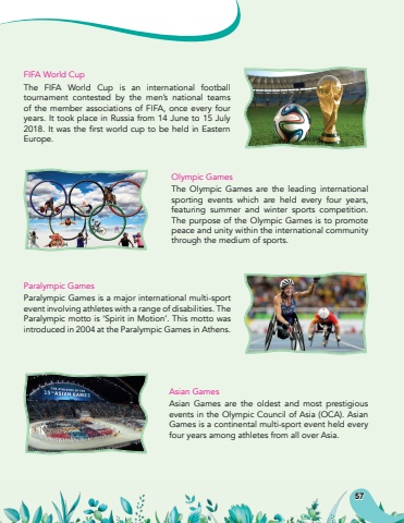 57Asian GamesAsian Games are the oldest and most prestigious events in the Olympic Council of Asia (OCA). Asian Games is a continental multi-sport event held every four years among athletes from all over Asia.FIFA World CupThe FIFA World Cup is an international football tournament contested by the men%u2019s national teams of the member associations of FIFA, once every four years. It took place in Russia from 14 June to 15 July 2018.ItwasthefirstworldcuptobeheldinEasternEurope.Olympic GamesThe Olympic Games are the leading international sporting events which are held every four years, featuring summer and winter sports competition. The purpose of the Olympic Games is to promote peace and unity within the international community through the medium of sports.Paralympic GamesParalympic Games is a major international multi-sport event involving athletes with a range of disabilities. The Paralympic motto is %u2018Spirit in Motion%u2019. This motto was introduced in 2004 at the Paralympic Games in Athens.