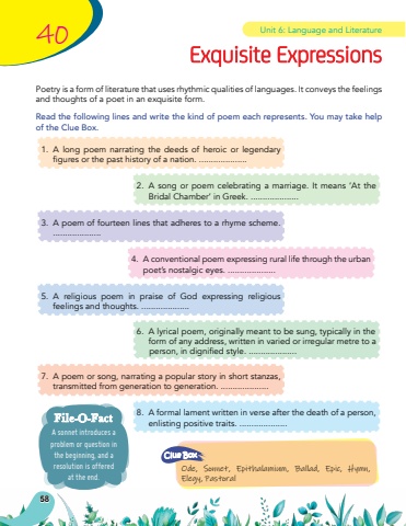 5840Poetry is a form of literature that uses rhythmic qualities of languages. It conveys the feelings and thoughts of a poet in an exquisite form.Read the following lines and write the kind of poem each represents. You may take help of the Clue Box.Ode, Sonnet, Epithalamium, Ballad, Epic, Hymn, Elegy, PastoralClue Box1.A long poem narrating the deeds of heroic or legendary figuresorthepasthistoryofanation.....................3.A poem of fourteen lines that adheres to a rhyme scheme. ....................6.A lyrical poem, originally meant to be sung, typically in the form of any address, written in varied or irregular metre to a person,indignifiedstyle.....................5.A religious poem in praise of God expressing religious feelings and thoughts. ....................8. A formal lament written in verse after the death of a person, enlisting positive traits. ....................2.A song or poem celebrating a marriage. It means %u2018At the Bridal Chamber%u2019 in Greek. ....................4.A conventional poem expressing rural life through the urban poet%u2019s nostalgic eyes. ....................7.A poem or song, narrating a popular story in short stanzas, transmitted from generation to generation. ....................Exquisite ExpressionsUnit 6: Language and LiteratureA sonnet introduces a problem or question in the beginning, and a resolution is offered at the end.File-O-Fact