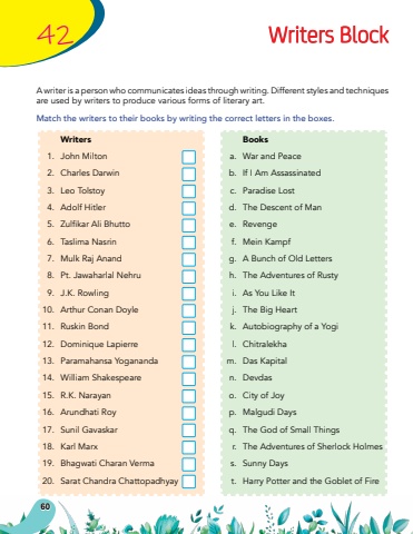 6042Writers BlockA writer is a person who communicates ideas through writing. Different styles and techniques are used by writers to produce various forms of literary art.Match the writers to their books by writing the correct letters in the boxes.WritersBooks 1.John Milton a.War and Peace 2.Charles Darwin b.If I Am Assassinated 3.Leo Tolstoy c.Paradise Lost 4.Adolf Hitler d.The Descent of Man %u0009 5.%u0009 ZulfikarAliBhuttoe.Revenge6.Taslima Nasrinf.Mein Kampf7.Mulk Raj Anandg.A Bunch of Old Letters8.Pt. Jawaharlal Nehruh.The Adventures of Rusty9.J.K. Rowlingi.As You Like It10.Arthur Conan Doylej.The Big Heart11.Ruskin Bondk.Autobiography of a Yogi12.Dominique Lapierrel.Chitralekha13.Paramahansa Yoganandam.Das Kapital14.William Shakespearen.Devdas15.R.K. Narayano.City of Joy16.Arundhati Royp.Malgudi Days17.Sunil Gavaskarq.The God of Small Things18.Karl Marxr.The Adventures of Sherlock Holmes19.Bhagwati Charan Vermas.Sunny Days20.Sarat Chandra Chattopadhyayt.Harry Potter and the Goblet of Fire