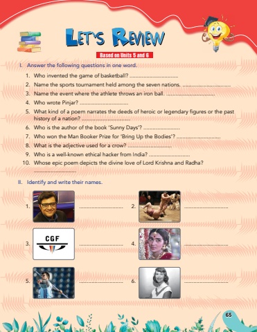 65I.Answer the following questions in one word.1.Who invented the game of basketball? ................................2.Name the sports tournament held among the seven nations. ................................3.Name the event where the athlete throws an iron ball. ................................4.Who wrote Pinjar? ................................%u0009 5.%u0009 Whatkindofapoemnarratesthedeedsofheroicorlegendaryfiguresorthepasthistory of a nation? ................................6.Who is the author of the book %u2018Sunny Days%u2019? ........................7.Who won the Man Booker Prize for %u2018Bring Up the Bodies%u2019? .............................8.What is the adjective used for a crow? .............................9.Who is a well-known ethical hacker from India? ...........................10.Whose epic poem depicts the divine love of Lord Krishna and Radha? ............................II.Identify and write their names.1..............................2..............................3..............................4..............................5..............................6..............................Based on Units 5 and 6