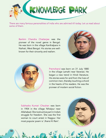66Bankim Chandra Chatterjee was the pioneer of the novel genre in Bengal. He was born in the village Kanthalpara in Naihati, West Bengal. His stories are wellknown for their sincerity and realism.Premchand was born on 31 July 1880 in the village Lamahi near Varanasi. He began a new trend in Hindi literature. His stories were for and from the lives of common men, thereby touching a chord in the hearts of his readers. He was the pioneerofmodernsocialfiction.Subhadra Kumari Chauhan was born in 1904 in the village Nihalpur near Allahabad. She took active part in India%u2019s struggleforfreedom.Shewasthefirstwoman to court arrest in Nagpur. Her most popular poem is %u2018Jhansi Ki Rani%u2019.There are many famous personalities of India who are admired till today. Let us read about some of them.