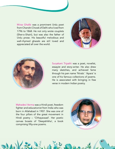 67Mirza Ghalib was a prominent Urdu poet from Chandni Chowk of Delhi who lived from 1796 to 1868. He not only wrote couplets (Sher-o-Shairi), but was also the father of Urdu prose. His beautiful melodious and well-rhymed ghazals are still loved and appreciated all over the world.Suryakant Tripathi was a poet, novelist, essayist and story-writer. He also drew many sketches, and achieved fame through his pen name %u2018Nirala%u2019. %u2018Apara%u2019 is one of his famous collections of poems. He is associated with bringing in free verse in modern Indian poetry.Mahadevi Verma was a Hindi poet, freedom fighterandeducationistfromIndiawhowasborn in Allahabad in 1907. She was one of the four pillars of the great movement in Hindi poetry %u2013 %u2018Chhayavaad%u2019. Her poetic canvas boasts of %u2018Deepshikha%u2019, a book comprisingfifty-onepoems.