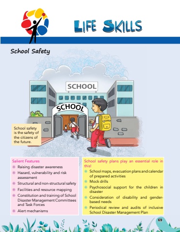 69School SafetySalient FeaturesjRaising disaster awarenessjHazard, vulnerability and risk assessmentjStructural and non-structural safetyjFacilities and resource mappingjConstitution and training of School Disaster Management Committees and Task ForcesjAlert mechanismsSchool safety plans play an essential role in this!jSchool maps, evacuation plans and calendar of prepared activitiesjMock drillsjPsychosocial support for the children in disasterjConsideration of disability and genderbased needsjPeriodical review and audits of inclusive School Disaster Management PlanSchool safety is the safety of the citizens of the future.