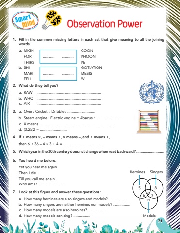 SmartMind71Observation Power1.Fill in the common missing letters in each set that give meaning to all the joining words.a.MIGHCOONFOR......................PHOONTHIRSPEb.SHIGOTIATIONMARI......................MESISFELIW2.What do they tell you?a.RAW............................................................b.WHO............................................................c.AIR............................................................3.a.Over : Cricket :: Dribble : ..........................b.Steam engine : Electric engine :: Abacus : ..........................c.X means ......................................................................d.(0.25)2 = ..........................4.If + means %u00d7, %u2013 means %u00f7, %u00d7 means %u2013, and %u00f7 means +,then 6 %u00f7 36 %u2013 4 %u00d7 3 + 4 = ......................................5.Which year in the 20th century does not change when read backward? ..........................6.You heard me before.Yet you hear me again.Then I die.Till you call me again.Who am I? ..........................7.Look at this figure and answer these questions :a.How many heroines are also singers and models? ................b.How many singers are neither heroines nor models? ................c.How many models are also heroines? ................d.How many models can sing? ................Models5886311SingersHeroines