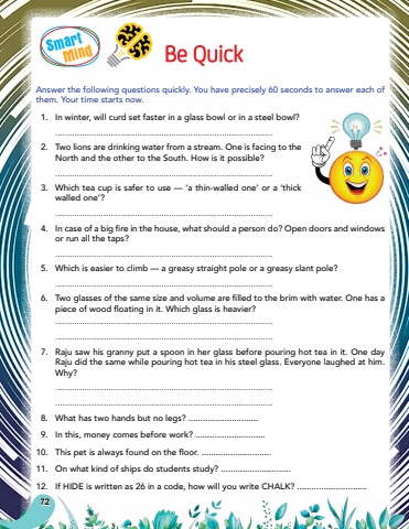 SmartMind72Be QuickAnswer the following questions quickly. You have precisely 60 seconds to answer each of them. Your time starts now.1.In winter, will curd set faster in a glass bowl or in a steel bowl?..........................................................................................2.Two lions are drinking water from a stream. One is facing to the North and the other to the South. How is it possible? ..........................................................................................3.Which tea cup is safer to use %u2014 %u2018a thin-walled one%u2019 or a %u2018thick walled one%u2019? ..........................................................................................4.In case of a big fire in the house, what should a person do? Open doors and windows or run all the taps?..........................................................................................5.Which is easier to climb %u2014 a greasy straight pole or a greasy slant pole? ..........................................................................................6.Two glasses of the same size and volume are filled to the brim with water. One has a piece of wood floating in it. Which glass is heavier?....................................................................................................................................................................................7.Raju saw his granny put a spoon in her glass before pouring hot tea in it. One day Raju did the same while pouring hot tea in his steel glass. Everyone laughed at him. Why? ....................................................................................................................................................................................8.What has two hands but no legs? .............................9.In this, money comes before work? .............................10.This pet is always found on the floor. .............................11.On what kind of ships do students study? .............................12.If HIDE is written as 26 in a code, how will you write CHALK? .............................