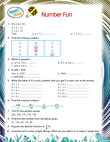 SmartMind731.If 3 + 4 = 104 + 5 = 135 + 6 = 16Thena. 6 + 7 = ................ ;b. 7 + 8 = ................2.Find the missing numbers :234510ab20353c3.Which is greater?a. 3/7 or 7/3 = ............ ;b. 9/7 or 3/4 = ............ ;c. 6/6 or 4/4 = ............4.If LIVE :: EVILthen a. 5232 :: ................. ;b. 9562 :: ................. ;c. MADAM :: ........................5.Write the table of 9 in such a pattern that you get 9 in each row at the answer:9 %u00d7 1 = ..................................9 %u00d7 6 = ..................................9 %u00d7 2 = ..................................9 %u00d7 7 = ..................................9 %u00d7 3 = ..................................9 %u00d7 8 = ..................................9 %u00d7 4 = ..................................9 %u00d7 9 = ..................................9 %u00d7 5 = ..................................9 %u00d7 10 = ................................6.Find the missing numbers:628 401 b 231a 140 990 1237.Tick (%uf033) the perfect square.625, 256, 215, 276, 7848.Find the odd number from the below given.51, 153, 69, 119, 859.Express the decimal fraction of 1 4%.10.A bucket full of water weighs 98 kgs. What can you add to it to make it weigh less?Number Fun
