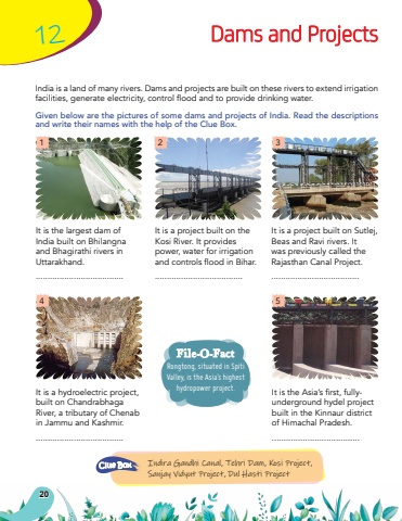 2012Dams and ProjectsIndia is a land of many rivers. Dams and projects are built on these rivers to extend irrigation facilities,generateelectricity,controlfloodandtoprovidedrinkingwater.Given below are the pictures of some dams and projects of India. Read the descriptions and write their names with the help of the Clue Box.Rongtong, situated in Spiti Valley, is the Asia%u2019s highest hydropower project.File-O-Fact14253It is a project built on the Kosi River. It provides power, water for irrigation andcontrolsfloodinBihar......................................ItistheAsia%u2019sfirst,fullyunderground hydel project built in the Kinnaur district of Himachal Pradesh......................................It is the largest dam of India built on Bhilangna and Bhagirathi rivers in Uttarakhand......................................It is a hydroelectric project, built on Chandrabhaga River, a tributary of Chenab in Jammu and Kashmir......................................It is a project built on Sutlej, Beas and Ravi rivers. It was previously called the Rajasthan Canal Project......................................Indira Gandhi Canal, Tehri Dam, Kosi Project, Sanjay Vidyut Project, Dul Hasti ProjectClue Box