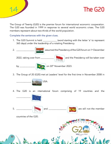 2214The G20The Group of Twenty (G20) is the premier forum for international economic cooperation. The G20 was founded in 1999 in response to several world economic crises. The G20 members represent about two-thirds of the world population.Complete the sentences with the given clues.1.The G20 Summit is held ____________ (word starting with the letter %u2018a%u2019 to represent 365 days) under the leadership of a rotating Presidency.2._______________ assumed the Presidency of the G20 forum on 1st December 2022, taking over from ___________ andthe Presidency will be taken over by _____________ on 30th November 2023.%u0009 3.%u0009 TheGroupof20(G20)metatLeaders%u2019levelforthefirsttimeinNovember2008in____________, USA.4.The G20 is an international forum comprising of 19 countries and the____________ .5._____________ and _______________ are still not the member countries of the G20.