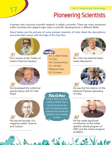 28Pioneering Scientists17Apersonwhoconductsscientificresearchiscalledascientist.TherearemanyrenownedIndianscientistswhoplayedmajorrolesinscientificdevelopmentsindifferentfields.Given below are the pictures of some pioneer scientists of India. Read the descriptions and write their names with the help of the Clue Box.He is known as the %u2018Father of India%u2019s Chemical Industry%u2019.HewasthefirstdirectoroftheNational Physical Laboratory of India....................................Hehasmadesignificantcontribution to the Indian satellite vehicle program of ISRO and the missile program of DRDO. ...................................He was the founder of a magazine called %u2018Science and Culture%u2019....................................He developed the conformal gravity theory with Sir Fred Hoyle. ...................................He is the man behind India%u2019s Green Revolution.In March 2010, a scientist created an element that is found to be heavier than lead. This element has been produced from calcium and berkelium, and is unstable in nature.File-O-FactA.P.J. Abdul Kalam, P.C. Ray, M.S. Swaminathan, J.V. Narlikar, Meghnad Saha, K.S. KrishnanClue BoxUnit 3: Science and Technology135246