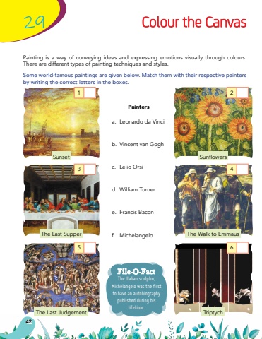 4229Colour the CanvasPainting is a way of conveying ideas and expressing emotions visually through colours. There are different types of painting techniques and styles.Some world-famous paintings are given below. Match them with their respective painters by writing the correct letters in the boxes. Paintersa.Leonardo da Vinci b.Vincent van Gogh c.Lelio Orsi d.William Turnere.Francis Bacon f.MichelangeloThe Italian sculptor, Michelangelo was the first to have an autobiography published during his lifetime.File-O-FactSunsetThe Last SupperThe Last JudgementSunflowersThe Walk to EmmausTriptych135246