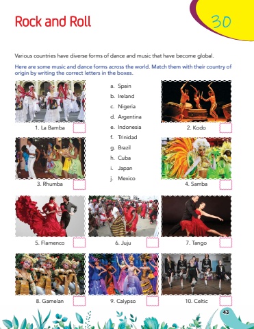 43Various countries have diverse forms of dance and music that have become global.Here are some music and dance forms across the world. Match them with their country of origin by writing the correct letters in the boxes.Rock and Roll30a.Spainb.Ireland c.Nigeriad.Argentinae.Indonesiaf.Trinidadg.Brazilh.Cubai.Japanj.Mexico1. La Bamba3. Rhumba5. Flamenco8. Gamelan6. Juju9. Calypso2. Kodo4. Samba7. Tango10. Celtic