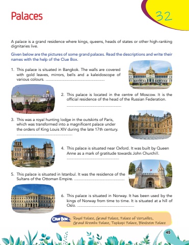 45Palaces32A palace is a grand residence where kings, queens, heads of states or other high-ranking dignitaries live.Given below are the pictures of some grand palaces. Read the descriptions and write their names with the help of the Clue Box.1.This palace is situated in Bangkok. The walls are covered with gold leaves, mirrors, bells and a kaleidoscope of various colours. .....................................................2.This palace is located in the centre of Moscow. It is the officialresidenceoftheheadoftheRussianFederation..................................................3.This was a royal hunting lodge in the outskirts of Paris, whichwastransformedintoamagnificentpalaceunderthe orders of King Louis XIV during the late 17th century. ..................................................4.This palace is situated near Oxford. It was built by Queen Anne as a mark of gratitude towards John Churchill. ...............................................5.This palace is situated in Istanbul. It was the residence of the Sultans of the Ottoman Empire. .............................................6.This palace is situated in Norway. It has been used by the kings of Norway from time to time. It is situated at a hill of Oslo. ...................................................Royal Palace, Grand Palace, Palace of Versailles, Grand Kremlin Palace, Topkapi Palace, Blenheim PalaceClue Box
