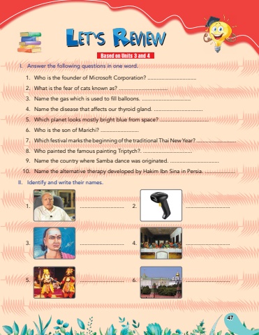 47I.Answer the following questions in one word.1.Who is the founder of Microsoft Corporation? ................................2.What is the fear of cats known as? ................................%u0009 3.%u0009 Namethegaswhichisusedtofillballoons.................................4.Name the disease that affects our thyroid gland. ................................5.Which planet looks mostly bright blue from space? ................................6.Who is the son of Marichi? .........................7.Which festival marks the beginning of the traditional Thai New Year? ..........................8.Who painted the famous painting Triptych?. ................................9.Name the country where Samba dance was originated. ................................10.Name the alternative therapy developed by Hakim Ibn Sina in Persia. ....................II.Identify and write their names.1..............................2..............................3..............................4..............................5..............................6..............................Based on Units 3 and 4