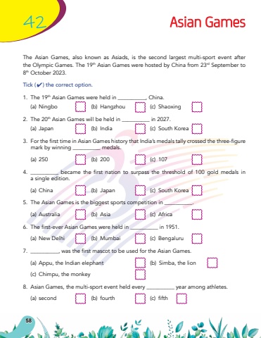 5842Asian GamesThe Asian Games, also known as Asiads, is the second largest multi-sport event afterthe Olympic Games. The 19th Asian Games were hosted by China from 23rd September to8th October 2023.Tick (4%u2009) the correct option.1.The 19th Asian Games were held in __________, China.(a)Ningbo(b)Hangzhou(c)Shaoxing2.The 20th Asian Games will be held in __________ in 2027.(a)Japan(b)India(c)South Korea3.%u0009 ForthefirsttimeinAsianGameshistorythatIndia%u2019smedalstallycrossedthethree-figuremark by winning __________ medals.(a)250(b)200(c)1074.%u0009 __________becamethefirstnationtosurpassthethresholdof100goldmedalsina single edition.(a)China(b)Japan(c)South Korea5.The Asian Games is the biggest sports competition in __________.(a)Australia(b)Asia(c)Africa6.%u0009 Thefirst-everAsianGameswereheldin__________in1951.(a)New Delhi(b)Mumbai(c)Bengaluru7.%u0009 __________,wasthefirstmascottobeusedfortheAsianGames.(a)Appu, the Indian elephant(b)Simba, the lion(c)Chimpu, the monkey8.Asian Games, the multi-sport event held every __________ year among athletes.(a)second(b)fourth%u0009 (c)fifth%u0009