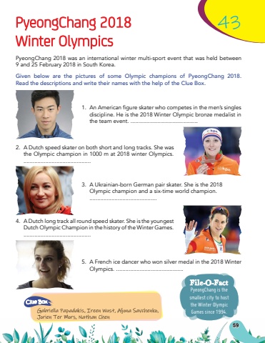 59PyeongChang 2018 43Winter OlympicsPyeongChang 2018 was an international winter multi-sport event that was held between 9 and 25 February 2018 in South Korea.Given below are the pictures of some Olympic champions of PyeongChang 2018.Read the descriptions and write their names with the help of the Clue Box.1.%u0009 AnAmericanfigureskaterwhocompetesinthemen%u2019ssinglesdiscipline. He is the 2018 Winter Olympic bronze medalist in the team event. ...........................................2.A Dutch speed skater on both short and long tracks. She was the Olympic champion in 1000 m at 2018 winter Olympics. ...........................................3. A Ukrainian-born German pair skater. She is the 2018 Olympic champion and a six-time world champion. ...........................................4.A Dutch long track all round speed skater. She is the youngest Dutch Olympic Champion in the history of the Winter Games. ...........................................5.A French ice dancer who won silver medal in the 2018 Winter Olympics. ...........................................Gabriella Papadakis, Ireen Wust, Aljona Savchenko, Jorien Ter Mors, Nathan ChenClue BoxPyeongChang is the smallest city to host the Winter Olympic Games since 1994.File-O-Fact