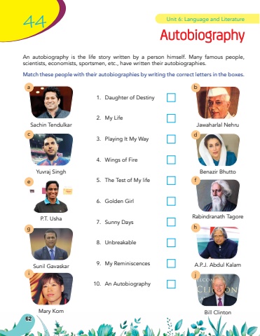 6244An autobiography is the life story written by a person himself. Many famous people, scientists, economists, sportsmen, etc., have written their autobiographies. Match these people with their autobiographies by writing the correct letters in the boxes.Sachin TendulkarJawaharlal NehruYuvraj SinghBenazir BhuttoP.T. UshaRabindranath TagoreSunil GavaskarA.P.J. Abdul KalamMary KomBill Clinton1.Daughter of Destiny2.My Life3.Playing It My Way4.Wings of Fire5.The Test of My life6.Golden Girl7.Sunny Days8.Unbreakable9.My Reminiscences10.An AutobiographyabcdefghijAutobiographyUnit 6: Language and Literature