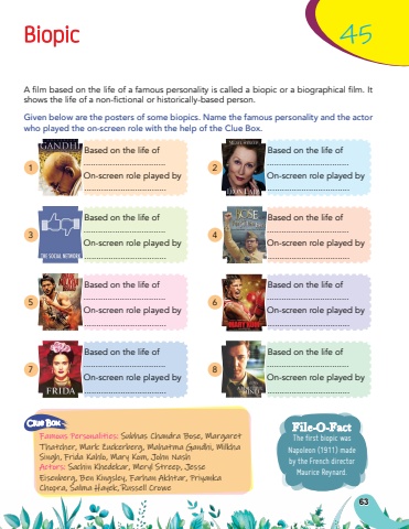 63Biopic45Afilmbasedonthelifeofafamouspersonalityiscalledabiopicorabiographicalfilm.Itshowsthelifeofanon-fictionalorhistorically-basedperson.Given below are the posters of some biopics. Name the famous personality and the actor who played the on-screen role with the help of the Clue Box.Based on the life of..................................On-screen role played by..................................1Based on the life of..................................On-screen role played by..................................2Based on the life of..................................On-screen role played by..................................3Based on the life of..................................On-screen role played by..................................4Based on the life of..................................On-screen role played by..................................5Based on the life of..................................On-screen role played by..................................6Based on the life of..................................On-screen role played by..................................7Based on the life of..................................On-screen role played by..................................8The first biopic was Napoleon (1911) made by the French director Maurice Reynard.File-O-FactFamous Personalities: Subhas Chandra Bose, Margaret Thatcher, Mark Zuckerberg, Mahatma Gandhi, Milkha Singh, Frida Kahlo, Mary Kom, John NashActors: Sachin Khedekar, Meryl Streep, Jesse Eisenberg, Ben Kingsley, Farhan Akhtar, Priyanka Chopra, Salma Hayek, Russell CroweClue Box