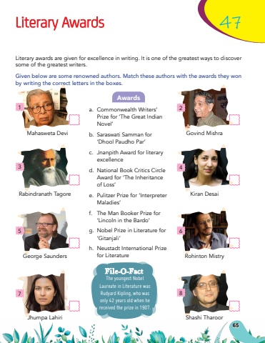 65Literary Awards47Literary awards are given for excellence in writing. It is one of the greatest ways to discover some of the greatest writers.Given below are some renowned authors. Match these authors with the awards they won by writing the correct letters in the boxes.a.Commonwealth Writers%u2019 Prize for %u2018The Great Indian Novel%u2019b.Saraswati Samman for %u2018Dhool Paudho Par%u2019c.Jnanpith Award for literary excellenced.National Book Critics Circle Award for %u2018The Inheritance of Loss%u2019e.Pulitzer Prize for %u2018Interpreter Maladies%u2019f.The Man Booker Prize for %u2018Lincoln in the Bardo%u2019g.Nobel Prize in Literature for %u2018Gitanjali%u2019h.Neustadt International Prize for LiteratureAwardsMahasweta Devi1Rabindranath Tagore3George Saunders5Jhumpa Lahiri7Shashi Tharoor8Rohinton Mistry6Kiran Desai4Govind Mishra2The youngest Nobel Laureate in Literature was Rudyard Kipling, who was only 42 years old when he received the prize in 1907.File-O-Fact