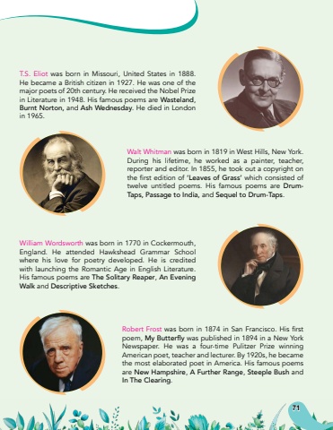71T.S. Eliot was born in Missouri, United States in 1888. He became a British citizen in 1927. He was one of the major poets of 20th century. He received the Nobel Prize in Literature in 1948. His famous poems are Wasteland, Burnt Norton, and Ash Wednesday. He died in London in 1965.William Wordsworth was born in 1770 in Cockermouth, England. He attended Hawkshead Grammar School where his love for poetry developed. He is credited with launching the Romantic Age in English Literature. His famous poems are The Solitary Reaper, An Evening Walk and Descriptive Sketches.Robert Frostwasbornin1874inSanFrancisco.Hisfirstpoem, My Butterfly was published in 1894 in a New York Newspaper. He was a four-time Pulitzer Prize winning American poet, teacher and lecturer. By 1920s, he became the most elaborated poet in America. His famous poems are New Hampshire, A Further Range, Steeple Bush and In The Clearing.Walt Whitman was born in 1819 in West Hills, New York. During his lifetime, he worked as a painter, teacher, reporter and editor. In 1855, he took out a copyright on thefirsteditionof%u2018Leaves of Grass%u2019 which consisted of twelve untitled poems. His famous poems are DrumTaps, Passage to India, and Sequel to Drum-Taps.