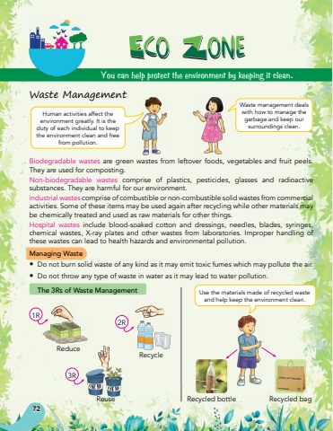 72You can help protect the environment by keeping it clean. Waste management deals with how to manage the garbage and keep our surroundings clean.ReduceReuseRecycle3R1R2RUse the materials made of recycled waste and help keep the environment clean.Recycled bagRecycled bottleHuman activities affect the environment greatly. It is the duty of each individual to keep the environment clean and free from pollution.Biodegradable wastes are green wastes from leftover foods, vegetables and fruit peels. They are used for composting.Non-biodegradable wastes comprise of plastics, pesticides, glasses and radioactive substances. They are harmful for our environment.Industrial wastes comprise of combustible or non-combustible solid wastes from commercial activities. Some of these items may be used again after recycling while other materials may be chemically treated and used as raw materials for other things.Hospital wastes include blood-soaked cotton and dressings, needles, blades, syringes, chemical wastes, X-ray plates and other wastes from laboratories. Improper handling of these wastes can lead to health hazards and environmental pollution.Managing Waste%u2022Do not burn solid waste of any kind as it may emit toxic fumes which may pollute the air.%u2022Do not throw any type of waste in water as it may lead to water pollution.Waste ManagementThe 3Rs of Waste Management