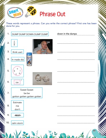 SmartMind77Phrase OutThese words represent a phrase. Can you write the correct phrase? First one has been done for you.1.DUMP DUMP DOWN DUMP DUMPdown in the dumps2.I8............................................................3.think uact............................................................4.In made dia............................................................5.cck lo............................................................6.ice3............................................................7.Sweet Sweetbe begotton gotten gotten gotten............................................................8.Estimatemedon%u2019t............................................................9. REST ............................................................10.calm storm........................................................................................................................